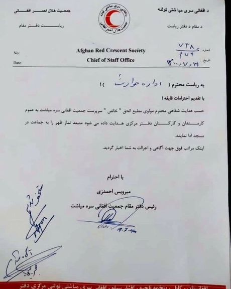 مولوی مطیع الله خالص، رییس گماشته شده طالبان در جمعیت هلال احمر افغانی به کارمندان این نهاد هدایت داده است که نماز ظهر را در جماعت و در مسجد ادا کنند. در نامه رسمی از این نهاد که در شبکههای اجتماعی منتشر شده این هدایت شفاهی مولوی خالص به همه کارمندان سرهمیاشت ابلاغ شده است.