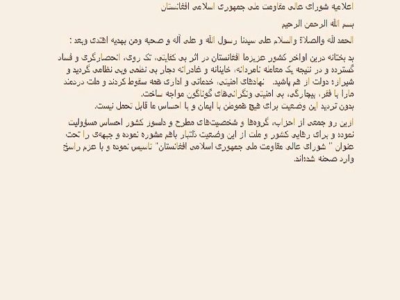 گروهی که خود را «شورای عالی مقاومت ملی جمهوری اسلامی افغانستان» معرفی کرده در بیانیهای از تشکیلات و اهدافش خبر داده است. در این اعلامیه گفته شده که شورا توسط جمعی از احزاب، گروهها و شخصیتهای مطرح کشور تاسیس شده است. در اعلامیه نام مشخصی از این افراد یا احزاب دیده نمیشود.