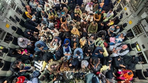 این عکس که از داخل یک هواپیمای نظامی گرفته شده، دهها شهروند بریتانیایی و افغان را نشان میدهد که در ماه آگست از کابل نجات داده شدند.