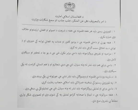 طالبان یک فرمان ۸ مادهای پیش روی نمایندگان رسانههای تصویری گذاشتهانند که فعالیت آنها را به برداشت سختگیرانه این گروه از شریعت اسلامی و ارزشهای جامعه افغانی محدود میکند.