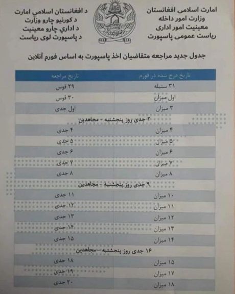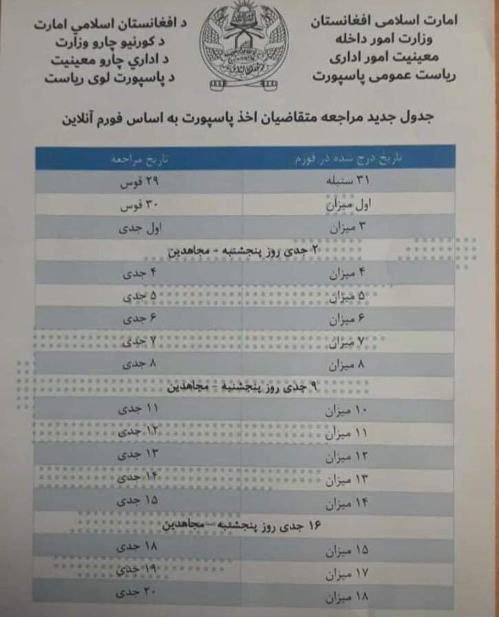 براساس جدولی که ریاست عمومی پاسپورت طالبان منتشر کرده، روزهای پنجشنبه تنها برای صدور پاسپورت به اعضای این گروه اختصاص داده شده است. طالبان گفته شهروندان کابل میتوانند در مابقی روزهای هفته، از شنبه تا چهارشنبه برای دریافت پاسپورت به این ریاست مراجعه کنند.
