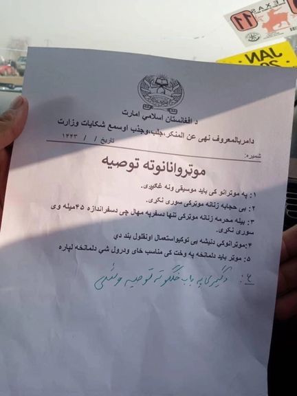 شهروند کابل میگویند توصیهنامهای از آدرس وزارت امر به معروف و نهی از منکر طالبان در میان رانندگان موترهای مسافربری کابل پخش شده است که در آن با لحن آمرانه تذکر داده شده که در موترهایشان موسیقی پخش نکنند و «زنان بیحجاب» را سوار موتر نسازید.