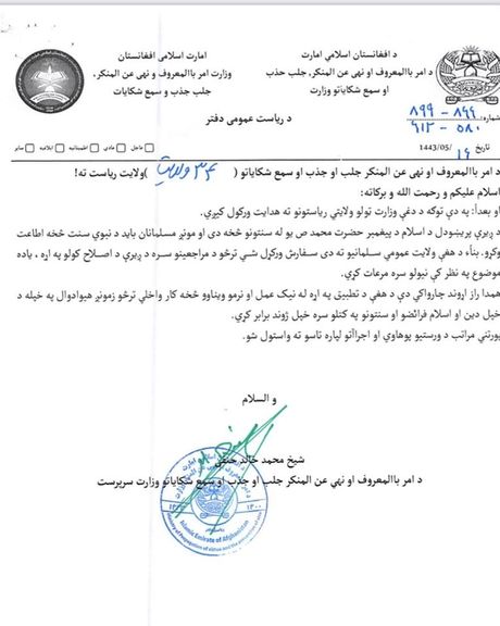 وزارت امر به معروف و نهی از منکر طالبان با ارسال نامهای به ریاستهای این وزارت در ۳۴ ولایت گفته است گذاشتن ریش، سنت پیغمبر است و ریاستهای این وزارت وظیفه دارند تا به سلمانها این موضوع را تذکر بدهند. در نامه آمده است: «کوتاه کردن ریش کمتر از یک قبضه حرام است.»