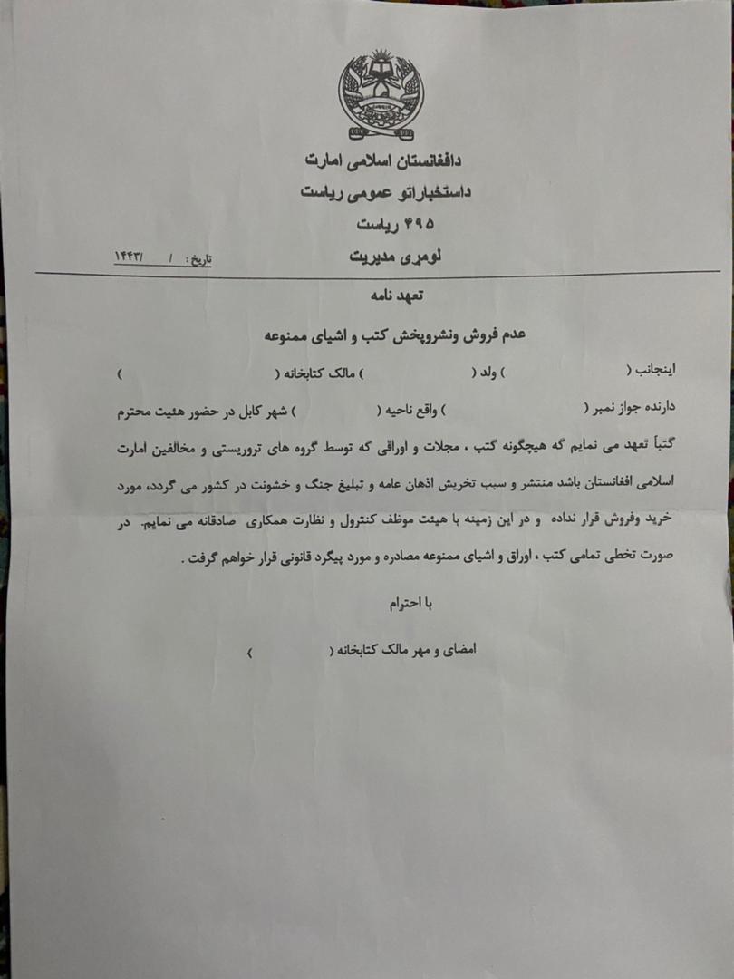 استخبارات طالبان فورمهایی میان کتابفروشان و ناشران توزیع کرده که از آنها تعهد میگیرد چنین آثاری نشر نکنند و به فروش نگذارند.