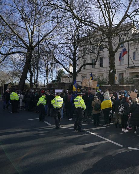 روز شنبه صدها نفر از اوکراینیهای مقیم لندن با تجمع در مقابل سفارت روسیه، خشم خود را از حمله به کشورشان ابراز کردند. آنان از پوتین خواستند نیروهای خود را از اوکراین بیرون کند. معترضان شعار دادند: «پوتین جنگ را متوقف کن»، «پوتین برو به خانه»، «اوکراین را رها کن»