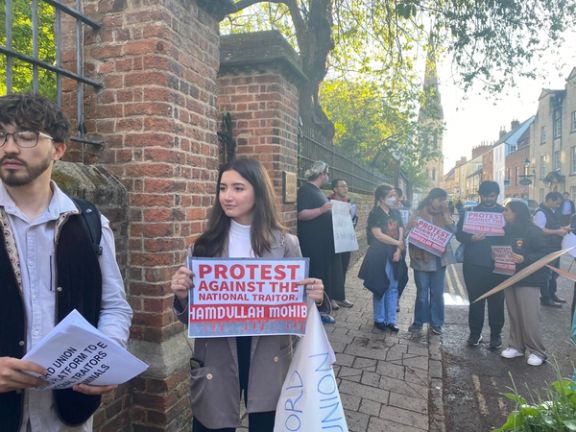 شماری از افغانها در اعتراض به سخنرانی حمدالله محب در برابر انجمن آکسفورد تجمع کردند