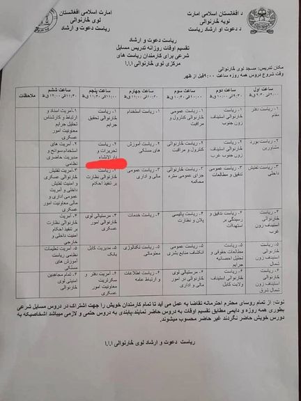 گروه طالبان برای کارمندان دادستانی کل افغانستان صنف درسهای شرعی برگزار کرده است. براساس دستور این گروه همه کارمندان دادستانی کل، براساس تقسیم اوقات، باید همه روزه در صنف حاضر شوند. منابع در دادستانی کل میگویند که بر اساس دستور طالبان کسی حق ندارد در جریان درس پرسشی مطرح کند.