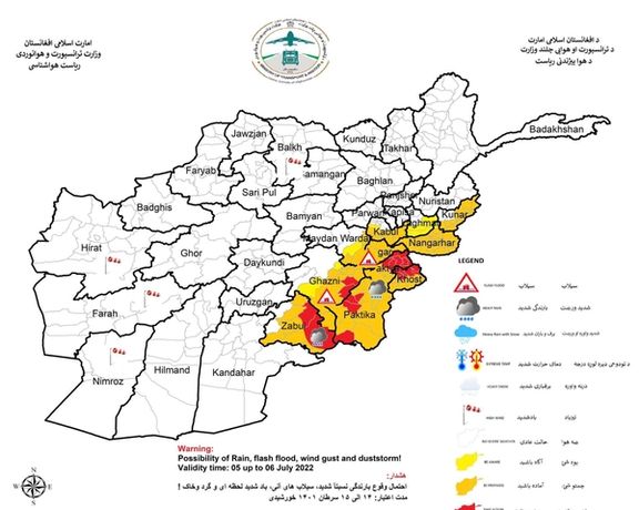 ریاست هواشناسی افغانستان از احتمال بارندگی نسبتا شدید همراه با رعد و برق، سیلابهای آنی، بادهای شدید لحظهای و گرد و خاک در ۱۵ ولایت هشدار داد. مقدار بارندگی در ولایتهای کابل، کنر، لغمان، ننگرهار، لوگر، پکتیکا، خوست، پکتیا، غزنی و زابل از ۱۰ تا ۱۵ ملی متر پیشبینی شده است.