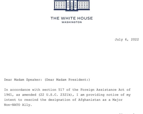 جو بایدن، رئیس جمهور امریکا در یک نامه رسمی به روسای مجلس نمایندگان و سنای امریکا اطلاع داد که قصد دارد عنوان «متحد اصلی امریکا در خارج از ناتو» را از افغانستان پس بگیرد حکومت اوباما در سال ۱۳۹۱ این عنوان را به افغانستان اعطا کرده بود.