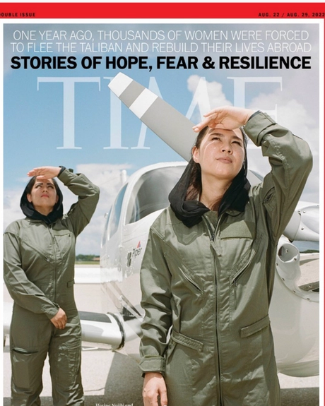 مجله امریکایی تایم یک سال پس از سقوط کابل با نشر مطلبی درباره ایستادگی زنان افغان، طرح روی جلدش را به عکسی از حسینه نجیبی و ریحانه رحیمی، دو زن خلبان افغانستان اختصاص داده است. این دو بانوی جوان یونیفورم نیروی هوایی حکومت پیشین افغانستان را به تن دارند.