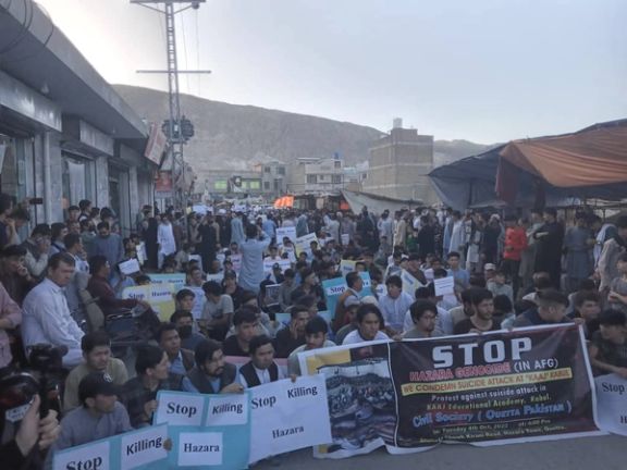 صدها تن از هزارههای کویته پاکستان در واکنش به حمله بر مرکز آموزشی کاج در کابل، راهپیمایی کردند و شعار دادند"نسلکشی هزارههای افغانستان را متوقف کنید." این راهپیمایی روز سهشنبه در میدان"هزاره تاون" برگزار شد، جاییکه در یک حمله انتحاری دهها تن از هزارههای کویته کشته شدند.