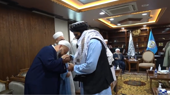 در تصاویری که رسانههای طالبان از دیدار هیات علمای ترکیهای با رهبران این گروه نشر کردهاند، یک عضو این هیات در حال بوسیدن دست سراجالدین حقانی، وزیر داخله طالبان و رهبر شبکه حقانی دیده میشود. این شبکه مسئول شماری از مرگبارترین حملات در بیست سال گذشته افغانستان شمرده میشود.