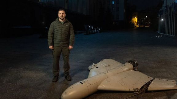 زلنسکی در کنار پهپاد سرنگون شده ایران: بال همه هیولاهای آهنی را در آسمان خود قطع میکنیم