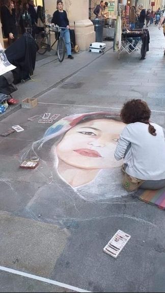 هنرمندی تصویر مرضیه، از قربانیان آموزشگاه کاج را در مرکز شهر بلونیای ایتالیا نقاشی کرد