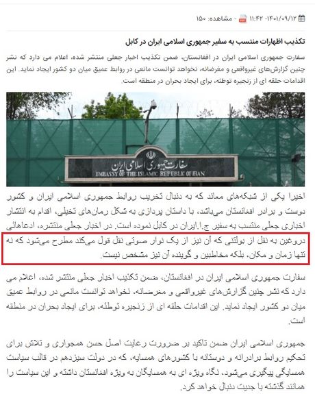 سفارت ایران در کابل تایید کرد که اظهارات بهادر امینیان درباره افغانستان و طالبان از بولتنی نقل شده که از روی یک نوار صوتی پیاده شده است. اشاره سفارت، به فایلهای هکشده خبرگزاری فارس است. این سفارت در عین حال خبری را که بر اساس این بولتن نوشته شده "جعلی و مغرضانه" خوانده است.