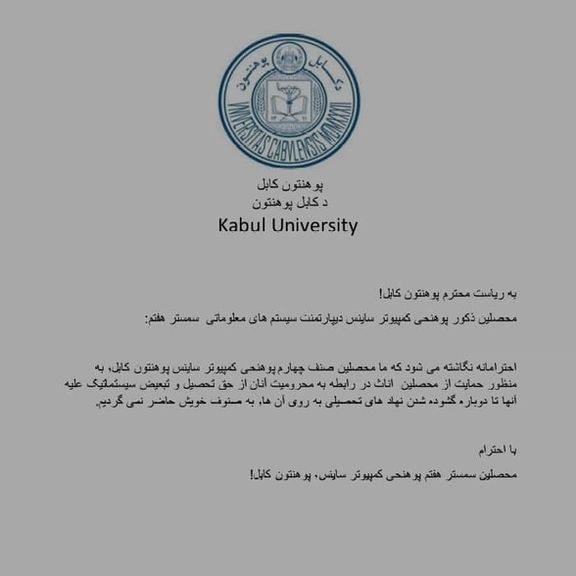 دانشجویان پسر دانشکده کمپیوتر ساینس دانشگاه کابل به تصمیم طالبان مبنی بر ممنوعیت آموزش دختران، اعتراض کردند. دانشجویان صنف چهارم این دانشکده روز شنبه در نامهای رسمی به ریاست دانشگاه کابل گفتهاند تا زمانی که مراکز آموزشی به روی دختران باز نشود، در صنف درسی خود حاضر نخواهند شد.