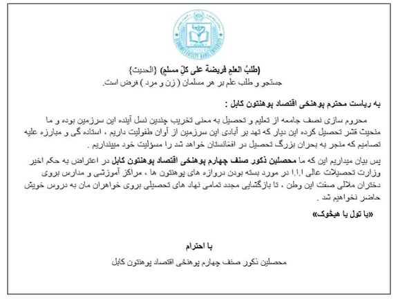 دانشجویان پسر صنف چهارم دانشکده اقتصاد دانشگاه کابل روز یکشنبه در نامهای به ریاست این دانشگاه نوشتند که «مبارزه علیه تصامیم تبعیضآمیز را مسئولیت خود میدانند.» این دانشجویان نوشتهاند: «تا زمان بازگشایی دروازه دانشگاهها به روی خواهرانمان، به دروس خویش حاضر نخواهیم شد.»