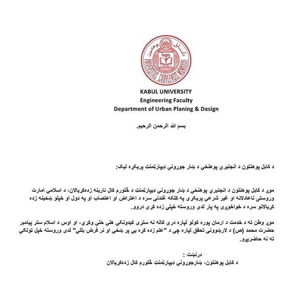 دانشجویان صنف چهارم دانشکده مهندسی شهرسازی دانشگاه کابل روز یکشنبه با ارسال نامهای به ریاست این دانشگاه خبر دادند که تا بازگشت دختران به دانشگاهها صنفهای درسی خود را تحریم کردهاند. این دانشجویان، تصمیم طالبان درباره ممنوعیت آموزش دختران را «ناعادلانه و غیرشرعی» خواندهاند.