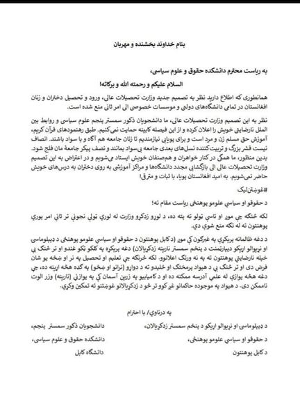 دانشجویان سمستر پنجم دانشکده حقوق و علوم سیاسی دانشگاه کابل اعلام کردند که «به امید افغانستان پویا، با ثبات و مترقی صنفهای درسی خود را تحریم میکنند.» این دانشجویان روز سهشنبه میگویند: «جامعه به زنان آگاه و با سواد نیاز دارد و انصاف نیست که آنها از حق آموزش محروم باشند.»