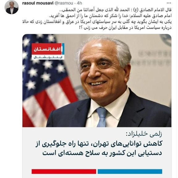 دستیار وزیر خارجه ایران به خبر افغانستان اینترنشنال درباره سخنان اخیر زلمی خلیلزاد راجع به برنامه هستهای تهران واکنش نشان داد. رسول موسوی از نماینده اسبق امریکا در افغانستان پرسید: چه گلی بر سر سیاستهای افغانستان و عراق زدی که حالا درباره سیاست امریکا مقابل ایران حرف میزنی؟