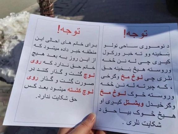 شماری از شهروندان و شاهدان عینی از مناطق مختلف کابل عکسهایی از اطلاعیههای تهدیدآمیز خطاب به زنان، به افغانستان اینترنشنال فرستادهاند. در این اطلاعیهها که مرجع توزیعکننده آن مشخص نیست، زنانی که با چهرههای عریان و بدون نقاب در شهر گشت و گذار میکنند، تهدید به مرگ شدهاند.
