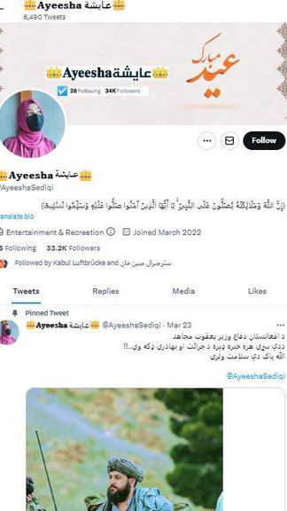 حساب توییتری دیگری به اسم «عایشه» با ۳۳ هزار دنبالکننده به نفع طالبان فعالیت میکند. تمام فعالیتش تبلیغ برای طالبان است. در پست اخیر توییتریاش عکسی از ملا یعقوب، وزیر دفاع طالبان همراه با متنی در ستایش او منتشر شده است. همینگونه حساب کاربری دیگر با نام «راضیه خوستی»، حساب مستعاری که با بیست هزار دنبالکننده به نفع طالبان تبلیغ میکند.