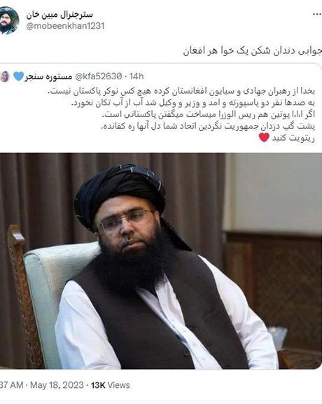 مبین خان، فعال رسانهای طالبان، با بازنشر یک پست توییتری حساب مستعار مستوره سنجر در مورد نخستوزیر موقت طالبان نوشته است: «جواب دندانشکن از خواهر افغان.»