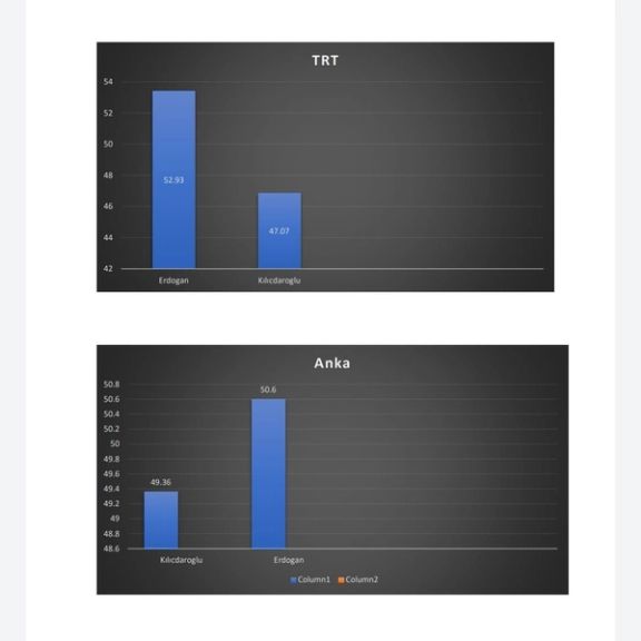 با شمارش حدود ۵۵ درصد آرای دومین دور انتخابات ریاستجمهوری ترکیه، رسانههای نزدیک به هر دو نامزد آمار متفاوتی از نتایج اولیه انتخابات منتشر کردند. آنادولو ادعا کرده که رجب طیب اردوغان با کسب ۵۵.۸ درصد آرا پیشتاز است و رقیب او کمال قلیچداراوغلو تنها ۴۴.۲ درصد آرا را گرفته است.