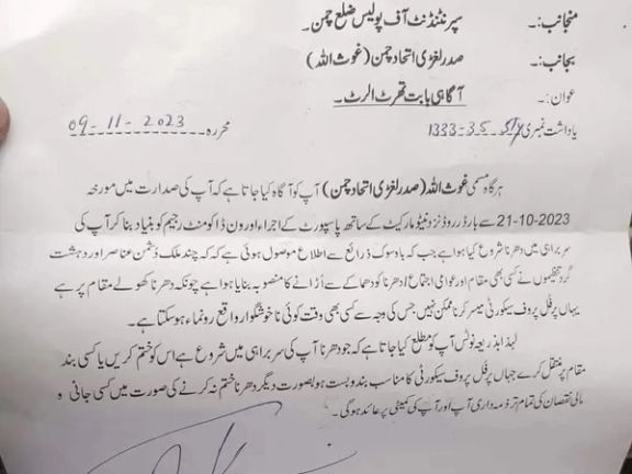 پولیس چمن در نامه رسمی که به نظر میرسد روز جمعه، ۱۹ عقرب، صادر شده باشد، به برگزارکنندگان تحصن نوشته است: «چند کشور تلاش دارند بر تحصنکنندگان حمله کنند».