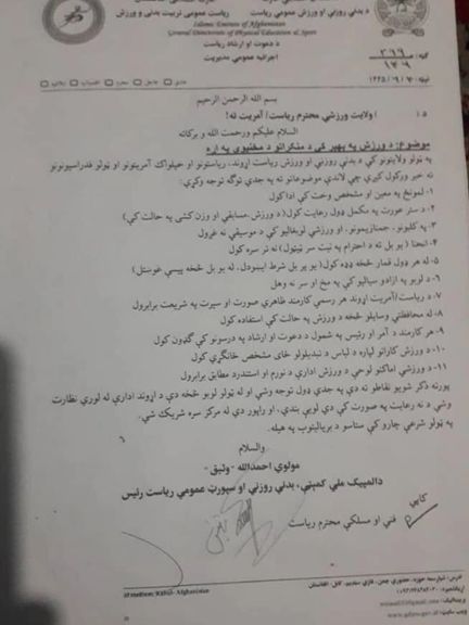 اداره تربیت بدنی و ورزش تحت حاکمیت طالبان، یک نامه دستوری به فدراسیونهای ورزشی فرستاده است. در دستور شماره ششم این نامه، ورزشکاران از ضربه زدن به سر و صورت یکدیگر منع شدهاند. این نامه که ١١ دستور دارد، رشتههای رزمی و مدالآور افغانستان را به وضعیت نامعلوم سوق داده است.