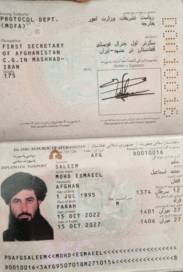 سلیم، عضو طالبان بهعنوان سکرتر اول جنرالقنسول افغانستان در مشهد کار میکرد.