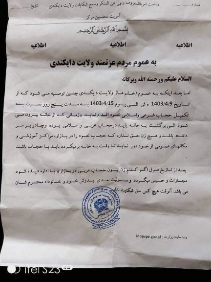 بر بنیاد یک اطلاعیه ریاست امر به معروف طالبان در ولایت دایکندی، به زنان دستور داده شده که «حجاب عربی و اسلامی» بپوشند و نباید در اماکن عمومی بردارند. طالبان به زنان در این ولایت هشدار داده است که در صورت سرپیچی، حبس و مجازات خواهند شد.