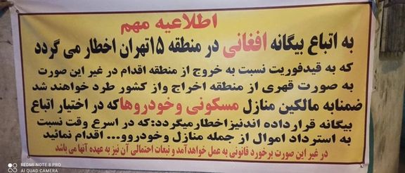 یک مخاطب دیگر افغانستان اینترنشنال از منطقه ۱۵ تهران (محل وقوع این درگیری) تصویر اطلاعیهای را فرستاده که در آن به مهاجران افغان هشدار داده شده است که فوراً این محله را ترک کنند. در این اطلاعیه که معلوم نیست از سوی چه فرد یا نهادی نشر شده، به مهاجران افغان اخطار داده شده است که از منطقه ۱۵ نروند، به صورت قهری از ایران اخراج خواهند شد.