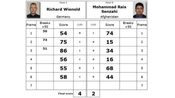 مسابقات جهانی سنوکر؛ رئیس خان سنزی از افغانستان در دور دوم مسابقات مغلوب حریفی از آلمان شد