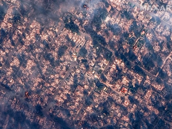 تصاویر هوایی نشان میدهد خانههای زیادی بهصورت بلوکبهبلوک تخریب شدهاند، و تصاویر ماهوارهای نیز ستونهای غلیظ دود را نشان میداد که از محل آتشها بهسمت جنوب غربی و روی اقیانوس آرام در حال حرکت است.