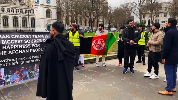 گروهی از هواداران کریکت افغانستان از شهرهای مختلف انگلستان با شعار «ما خواهان حق آموزش برای دختران هستیم و کریکت را نیز میخواهیم» امروز پنجشنبه ٢٧ جدی ١٤٠٣ در حمایت از تیم ملی کریکت افغانستان مقابل پارلمان بریتانیا در شهر لندن انگلستان تجمع کردند.