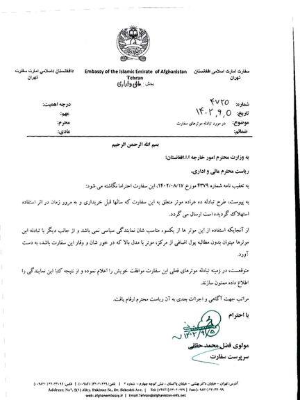 سفارت طالبان در تهران خواستار خرید ۱۰ موتر جدید به منظور حفظ «وقار دیپلوماتیک» خود شد. در یک نامه رسمی افشا شده از سفارت طالبان در تهران به وزارت خارجه در کابل آمده است که استفاده از موترهای دوره جمهوریت «مناسب شأن نمایندگی سیاسی نمیباشد.»