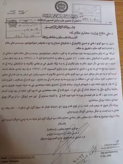 نامهای با امضای وزیر دفاع طالبان به دست افغانستان اینترنشنال رسیده است که در آن یعقوب مجاهد به وزارت داخله و ریاست استخبارات این گروه گفته است که در تنقیص ۲۰ درصدی نیروها، نخست «افراد منفور و نامطلوب» برکنار شوند.