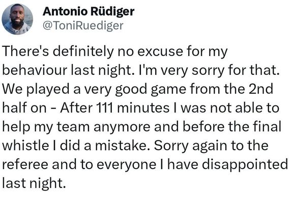 آنتونیو رودیگر، مدافع آلمانی رئال مادرید که در آخرین دقایق الکلاسیکو شب گذشته رفتار زننده و پرخاشگرانه نسبت به داور مسابقه داشت، از رفتار خود عذر خواهی کرد: «هیچ توجیهی برای رفتارم در شب گذشته وجود ندارد، واقعا متاسفم. از داور و همه کسانی که ناامیدشان کردم، عذرخواهی میکنم.»
