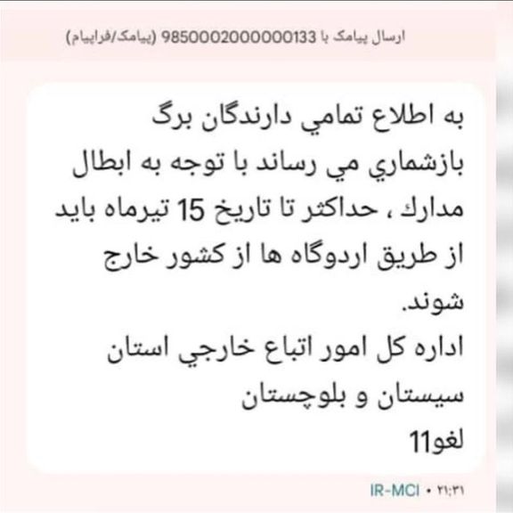 سازمان حقوقبشری حالوش گزارش داد که شماری از مهاجران افغان در ایران پیامکی از اداره اتباع سیستانوبلوچستان دریافت کردهاند که در آن به آنها دستور داده شده تا ۱۵ سرطان خاک ایران را ترک کنند. طبق گزارش، برخی از این مهاجران در ایران متولد شدهاند.