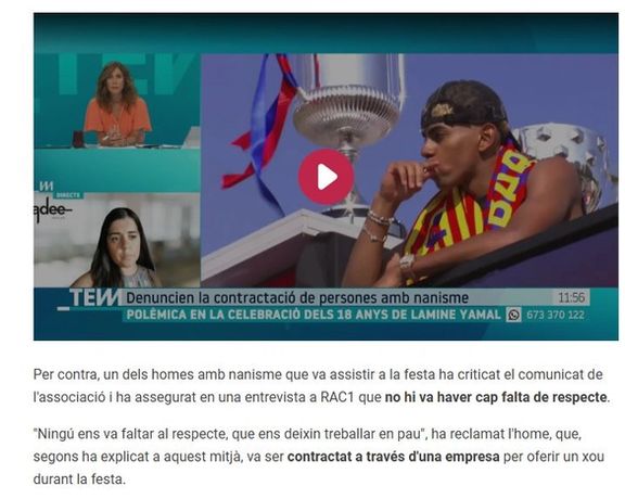 جشن تولد ١٨سالگی لامین یامال، بازیکن بارسلونا با واکنشهای متفاوتی روبهرو شده. حضور افراد کوتاهقامت در این مراسم که برای سرگرمی مهمانان دعوت شده بودند، باعث ایجاد جنجال در رسانههای اسپانیا شده است. یکی از کوتاهقامتان این جشن گفته، ما مهمان بودیم، رفتار او با ما محترمانه بود.