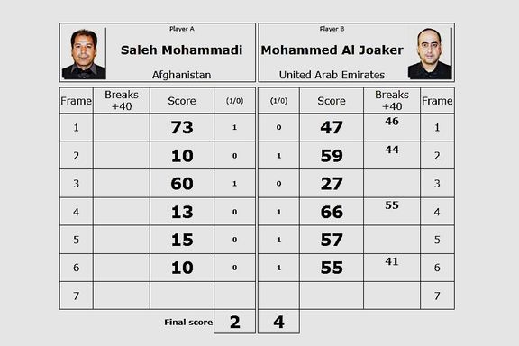 صالح محمد محمدی، نایبقهرمان رقابتهای ماستران جهان و ملیپوش سنوکر افغانستان، در مرحله یکهشتم نهایی رقابتهای جهانی سنوکر ۲۰۲۵ در بحرین با نتیجه ٢-٤ مغلوب محمد الجوکر از امارات متحده عربی شد. محمدی با این شکست از راهیابی به مرحله یکچهارم نهایی مسابقات ماستران باز ماند.