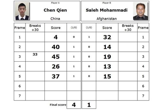 صالح محمد محمدی، ملیپوش سنوکر افغانستان در مرحله یکهشتم نهایی شش توپ رقابتهای جهانی سنوکر با نتیجه ١-٤ مغلوب چِن کوین از چین شد. محمدی با این شکست نتوانست به مرحله یکچهارم نهایی صعود کند. ستاره سنوکر افغانستان در سال ٢٠٢٤ و در بخش ماستران، نایب قهرمان جهان شده بود.
