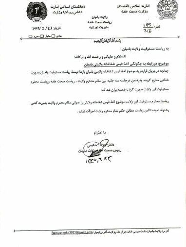 در ادامه این نامه آمده که این موضوع «در جلسه سهجانبه بین مقام محترم ولایت، ریاست صحت عامه و ریاست محترم مستوفیت» نیز مطرح شده است. رئيس صحت عامه اما از ریاست مستوفیت طالبان خواسته است که این درخواست را بهصورت کتبی مطرح کند تا در شفاخانه ولایتی بامیان اجرا شود.