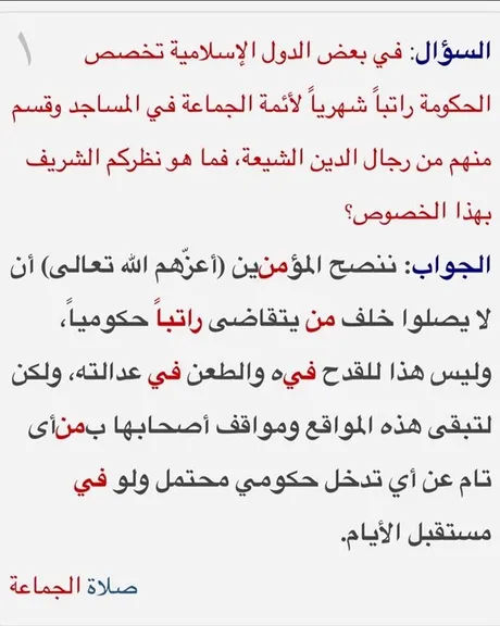 آیتالله علی سیستانی، از مراجع تقلید شیعیان، در پاسخ به پرسشی درباره دریافت حقوق دولتی توسط امامان جماعت اعلام کرد که توصیه میکند روحانیون از پذیرش این حقوق خودداری کنند. او همچنین گفته است توصیه میکند پشت سر امامان جماعتی که حقوق دولتی دریافت میکنند نماز خوانده نشود.
