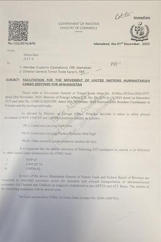 وزارت تجارت پاکستان روز چهارشنبه ۱۲ قوس اعلام کرد که پس از مشورت با وزارت خارجه، با عبور مرحلهای محمولههای کمکهای بشردوستانه سازمان ملل به افغانستان موافقت کرده است. هدف از این تصمیم، تامین نیازهای حیاتی مردم افغانستان از جمله مواد غذایی، دارو و تجهیزات پزشکی عنوان شده است.