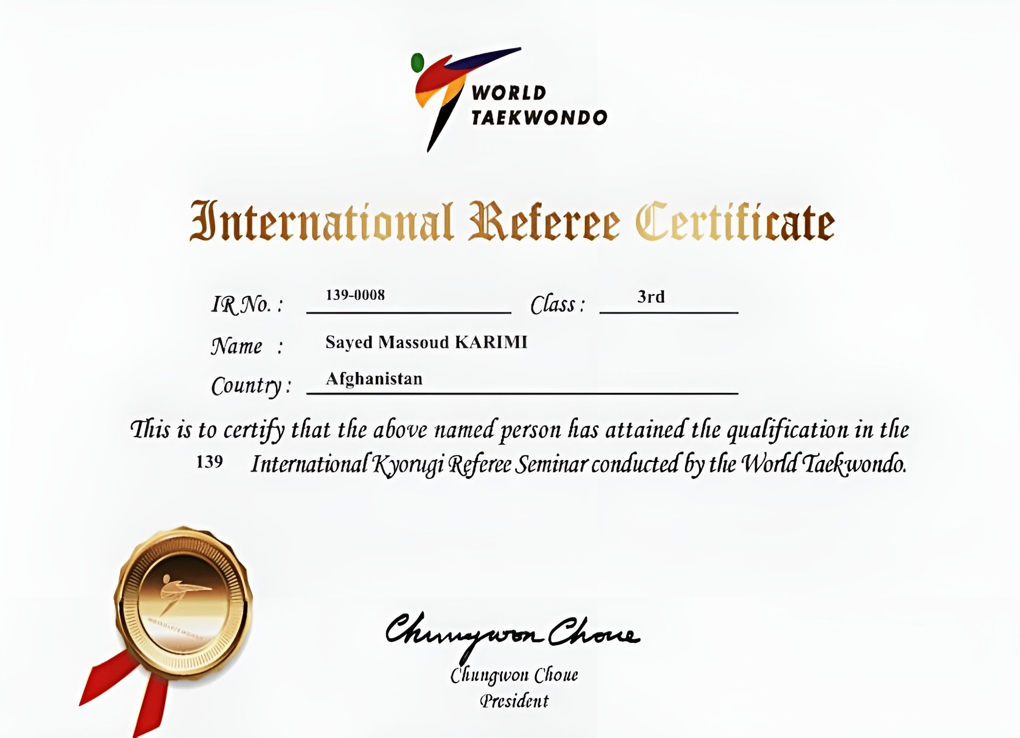 فدراسیون تکواندو افغانستان اعلام کرد که سید مسعود کریمی، کاپیتان پیشین تیم ملی تکواندو کشور، موفق به دریافت سند داوری بینالمللی کیوروگی (درجه سوم) از فدراسیون جهانی تکواندو (World Taekwondo) شده است.