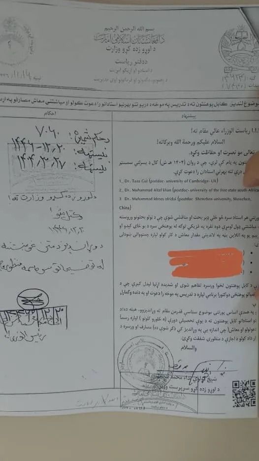 در مکتوب وزارت تحصیلات عالی طالبان که به ریاستالوزرا فرستاده شده، آمده است: «دانشگاه کابل در نظر دارد برای سمستر بهاری سه استاد خارجی به نامهای داکتر تازهگل، محمد الطاف خان و افریدی را استخدام کند.»