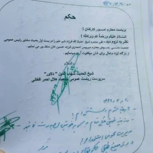 این اسناد که روز جمعه، پنجم جدی، به دسترس بخش پشتوی افغانستان اینترنشنال قرار گرفته، نشان میدهند که رئیس عمومی جمعیت هلالاحمر طالبان با امضای خود خسر دخترش را در بست اول تعیین کرده است.