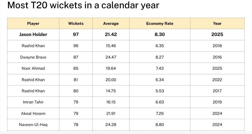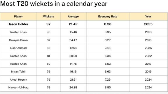 جیسون هولدر، آلراوندر تیم ملی کریکت ویستاندیز، پس از هفت سال رکورد جهانی بیشترین ویکت در یک سال میلادی را شکست؛ رکوردی که پیش از این به نام راشد خان آرمان، ستاره کریکت افغانستان، ثبت شده بود.